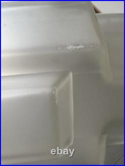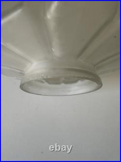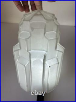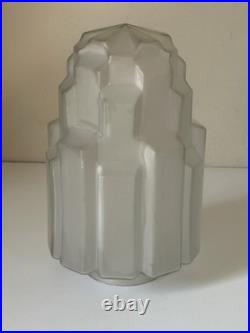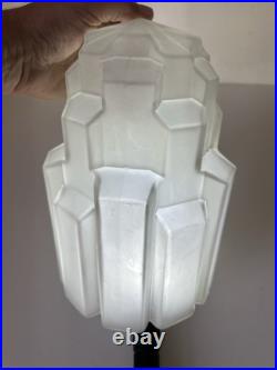 Verre Skyscraper Building Art Déco 1930 Lampe. Très belle verrerie de lampe ou plafonnier de style art déco d'époque 1930 en verre moulé pressé, il est en bon état général quelques griffes dues au stockage, et un plus sérieux nettoyage à la brosse serait de rigueur. Dimensions : 32 cm de haut et 19 cm de diamètre. Je n'utilise pas mondial relay. Les photos complètent ma description merci de les regarder attentivement.